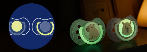 Dynamický dudlík LOVI z kolekce CAPICHILL má střed a úchytku svítící ve tmě, což usnadňuje jeho hledání v noci.