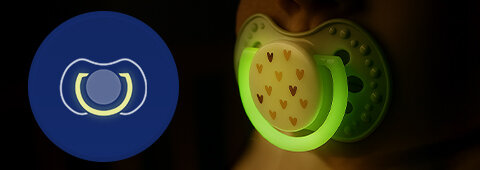 Dudlík má úchytku svítící ve tmě, což usnadňuje jeho hledání v noci.