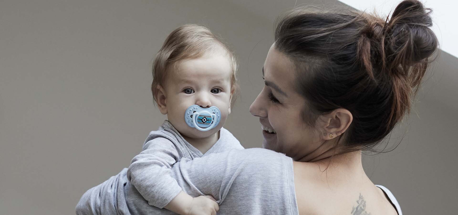 Erleichtert das Greifen und Übergeben des Schnullers an das Kind.