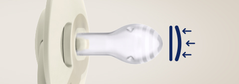 Der dynamische Beruhigungssauger dehnt sich dank seiner einzigartigen Konstruktion aus Silikon in verschiedenen Stärken aus und zieht sich entsprechend dem Saugrhythmus des Babys zusammen. Dadurch wird sein Saugreflex geschützt und das Stillen nicht beeinträchtigt. Die symmetrische Form des Saugers ist der Form einer mit Milch gefüllten Brustwarze nachempfunden und vermittelt dem Baby ein vertrautes Gefühl, das dem der Brust ähnelt.