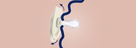 Das Schnullerschild hat eine spezielle Aussparung, die das Atmen durch die Nase und das Schlucken von Speichel erleichtert, genau wie an der Brust. Das konturierte Schild haftet so wenig wie möglich an der Haut des Kindes, was den freien Luftstrom erleichtert und das Risiko von Hautreizungen verringert.