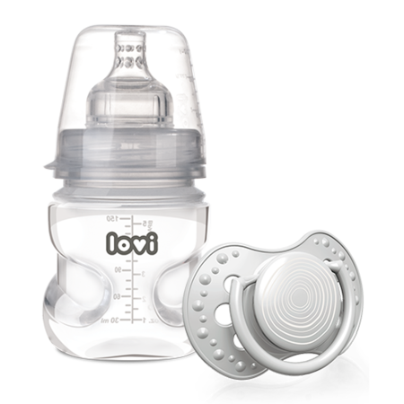 Das LOVI Set, das den Saugreflex nicht behindert, besteht aus der LOVI Medical+ Flasche mit Dynamic Feeding Sauger und einem LOVI Dynamic Schnuller.