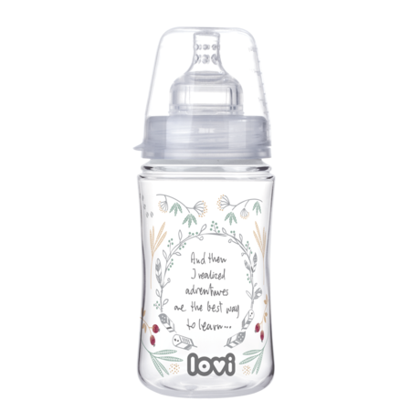 LOVI Trends Flasche für die Ernährung von Babys mit Muttermilch. Mit effektiven Designs bedruckt auf dem neuesten Stand der Trends. Ausgestattet mit einem einzigartigen Dynamic Feeding Teat® mit dünnem, vorstehendem Ende, einem harten, profilierten Boden und SUPERvent Luftauslasssystem. Erhältlich in zwei Kollektionen: Indian Summer und Botanic. Die Flasche ist mit allen LOVI Brustpumpen kompatibel.