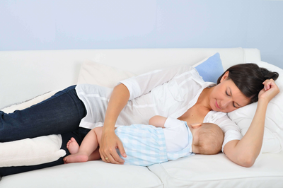 Colócate de de lado, apoyando la espalda, los hombros y la cabeza sobre las almohadas. Puedes poner una almohada entre tus rodillas para mayor comodidad. Coloca al bebé frente a ti con la cara opuesta a tu pecho y la barriga. Al principio, cuando el bebé sea pequeño, colócalo en tu antebrazo con la cabeza en el pliegue del codo o en una almohada. Cuando el bebé sea mayor, colócalo en un sofá. Tus piernas deben estar ligeramente flexionadas.