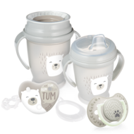Easy to clean, enables drinking without spilling. When shaken vigorously or dropped, droplets of liquid can come out. It teaches the child to control its movements and prepares them to drinking from an open cup.