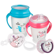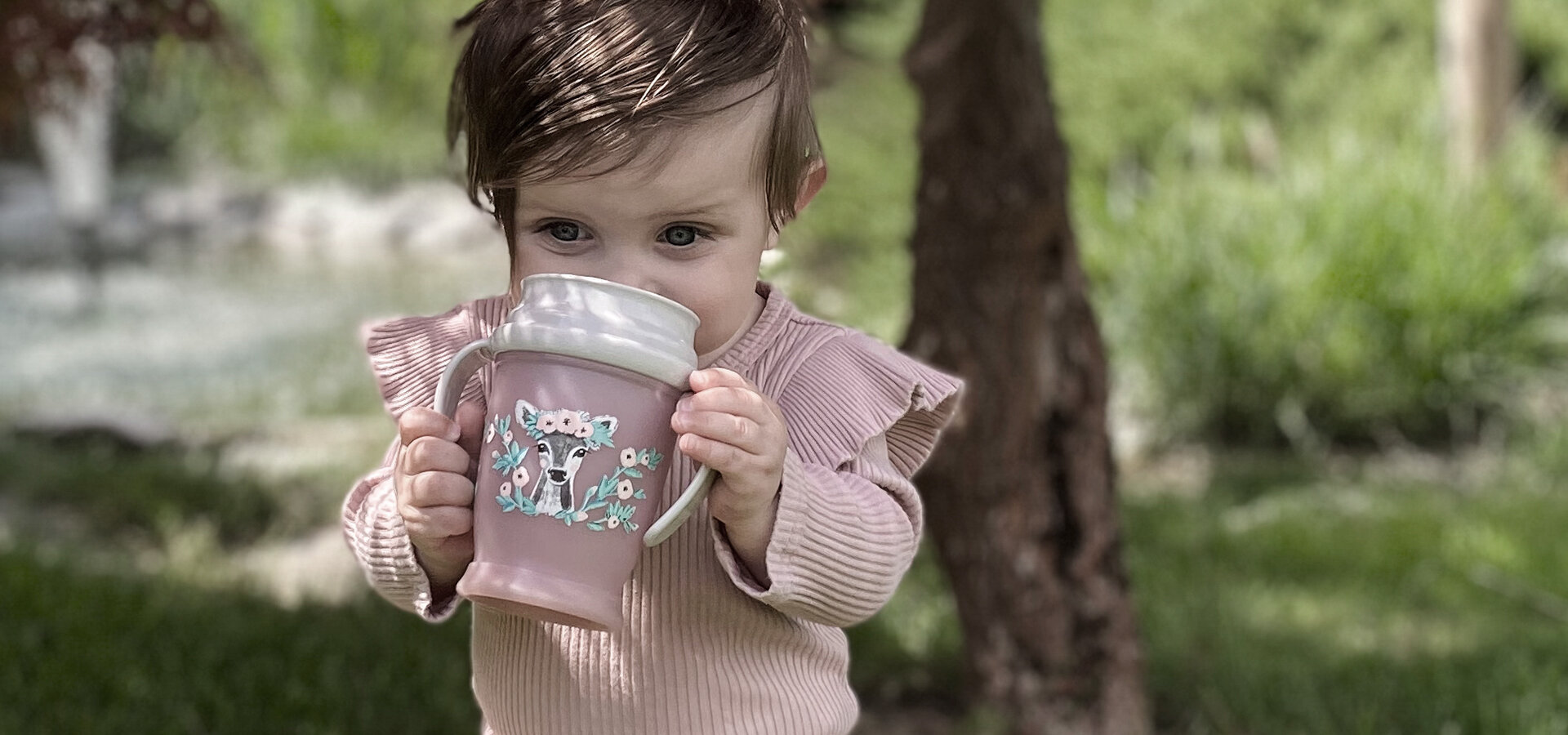 Before the learning session remember to show the fluid in the cup to the child and moisten the edge (or the mouthpiece) of the cup. This way the baby will be able to suck the fluid better – it will know that the cup is for drinking, and not for biting and playing. During drinking lessons, before the child knows how to appropriately extract the fluid, it should be sitting to avoid choking. Never leave the child alone with the cup in its hands.