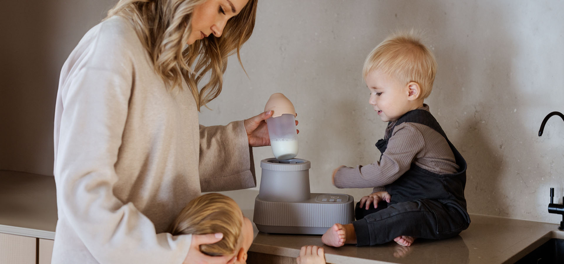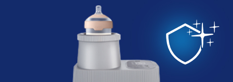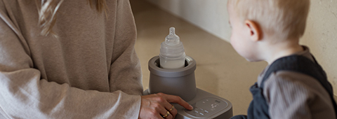 A young brunette is using a LOVI bottle warmer.