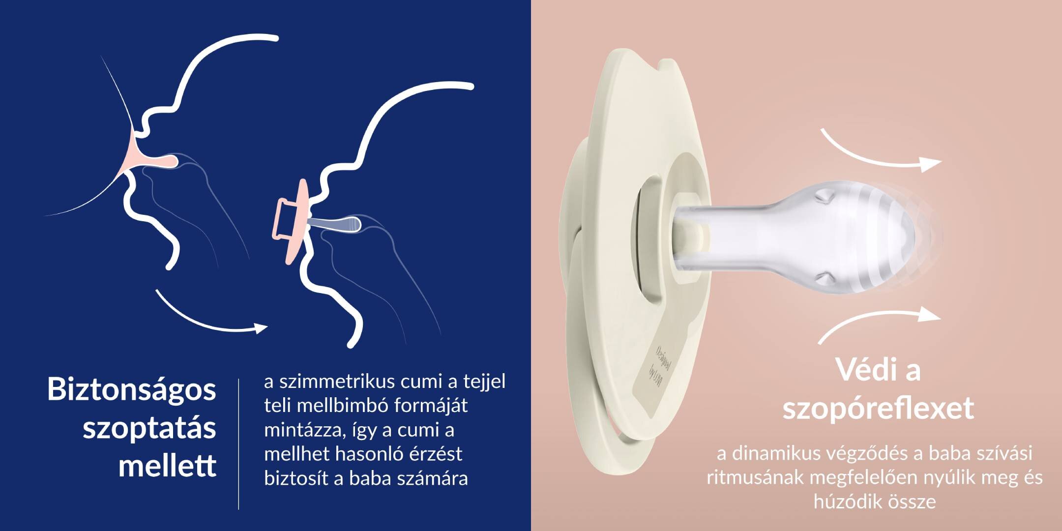 Az egyedülálló, különböző vastagságú szilikonszerkezetnek köszönhetően a cumi végződése a baba szopási ritmusának megfelelően nyúlik meg és húzódik össze. Ez védi a szopóreflexét, és nem befolyásolja hátrányosan a szoptatást.