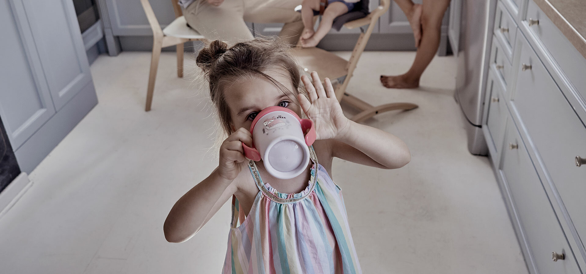 Lengva valyti, leidžia gerti neapsiliejant. Papurčius ar numetus, lašai ištrykšta išorėje, todėl vaikas mokosi valdyti savo judesius ir ruošiasi gerti iš atviro puodelio. Puodelio dangtelis parduodamas atskirai.