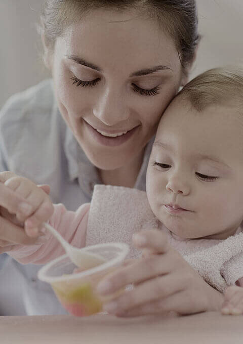 Colocamos uma pequena quantidade de comida numa colher que deve ser pequena, firme, estreita e não muito funda. Mostramos a colher ao bebé e aproximamo-la da sua boca. Quando o bebé vê a colher, normalmente abre a boca. Se não a abrir, pode tocar-lhe suavemente no lábio superior. Colocamos o recipiente da colher com o seu conteúdo na boca do bebé. Se a boca ficar aberta e o lábio superior não recolher a comida da colher, pode pressionar ligeiramente o meio da língua com a colher, o que fará com que a boca se feche. Se o bebé tiver apertado firmemente os lábios na colher ou a tiver mordido com as gengivas, é preciso esperar que ele se solte e retirar a colher da boca. A alimentação com colher é um elemento importante para ensinar o bebé a comer. Esta atividade fortalece os músculos circulares da boca e ensina o bebé a utilizar corretamente a língua. Utilizamos uma colher para alimentar os alimentos sob a forma de puré, mousse ou creme, com a qual se ensina o bebé a comer outros alimentos que não os de consistência líquida. A ingestão de alimentos sob esta forma exige que a língua e os outros músculos da boca funcionem corretamente para transportar os alimentos para o esófago de forma eficaz e segura.